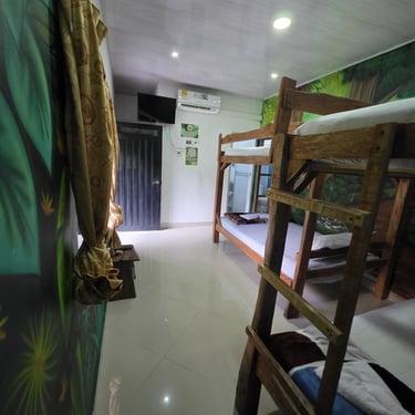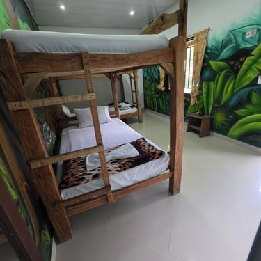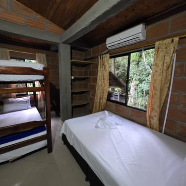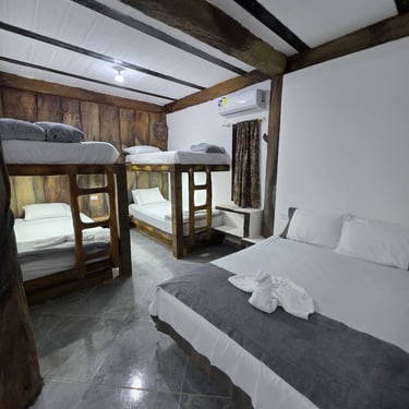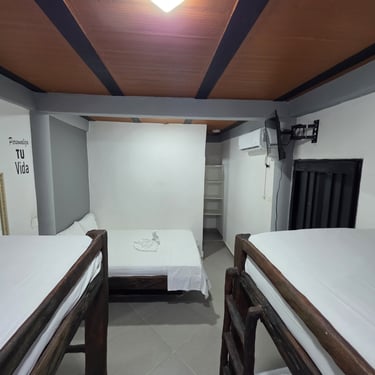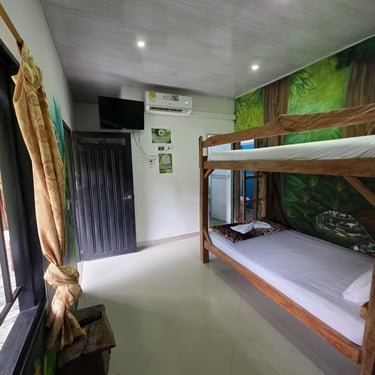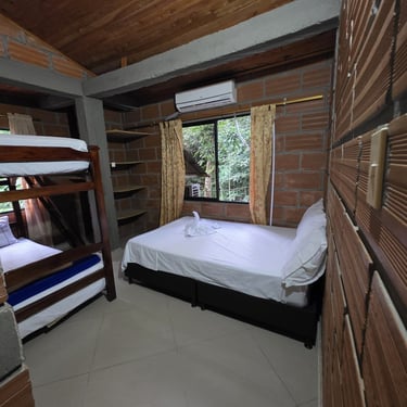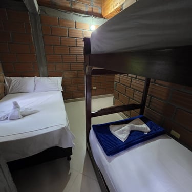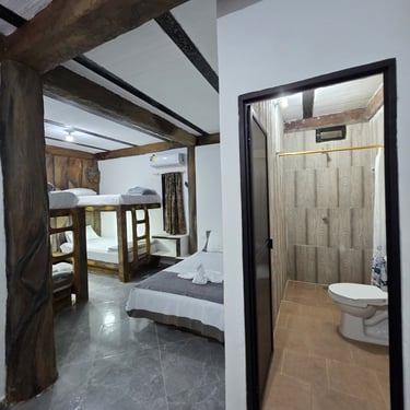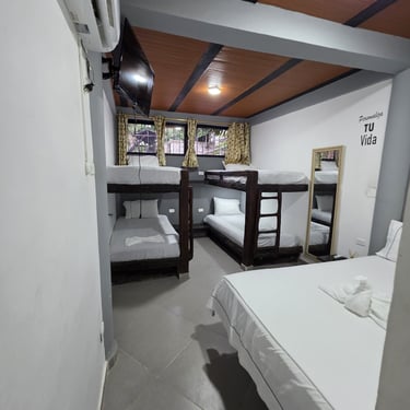 Pensada especialmente para que disfrutes al máximo con quienes más amas 👨👩👧👦, esta habitación cuenta con 2 camarotes de 1 mt y una cama de 1.4mt 🛏️, ideales para descansar cómodamente.